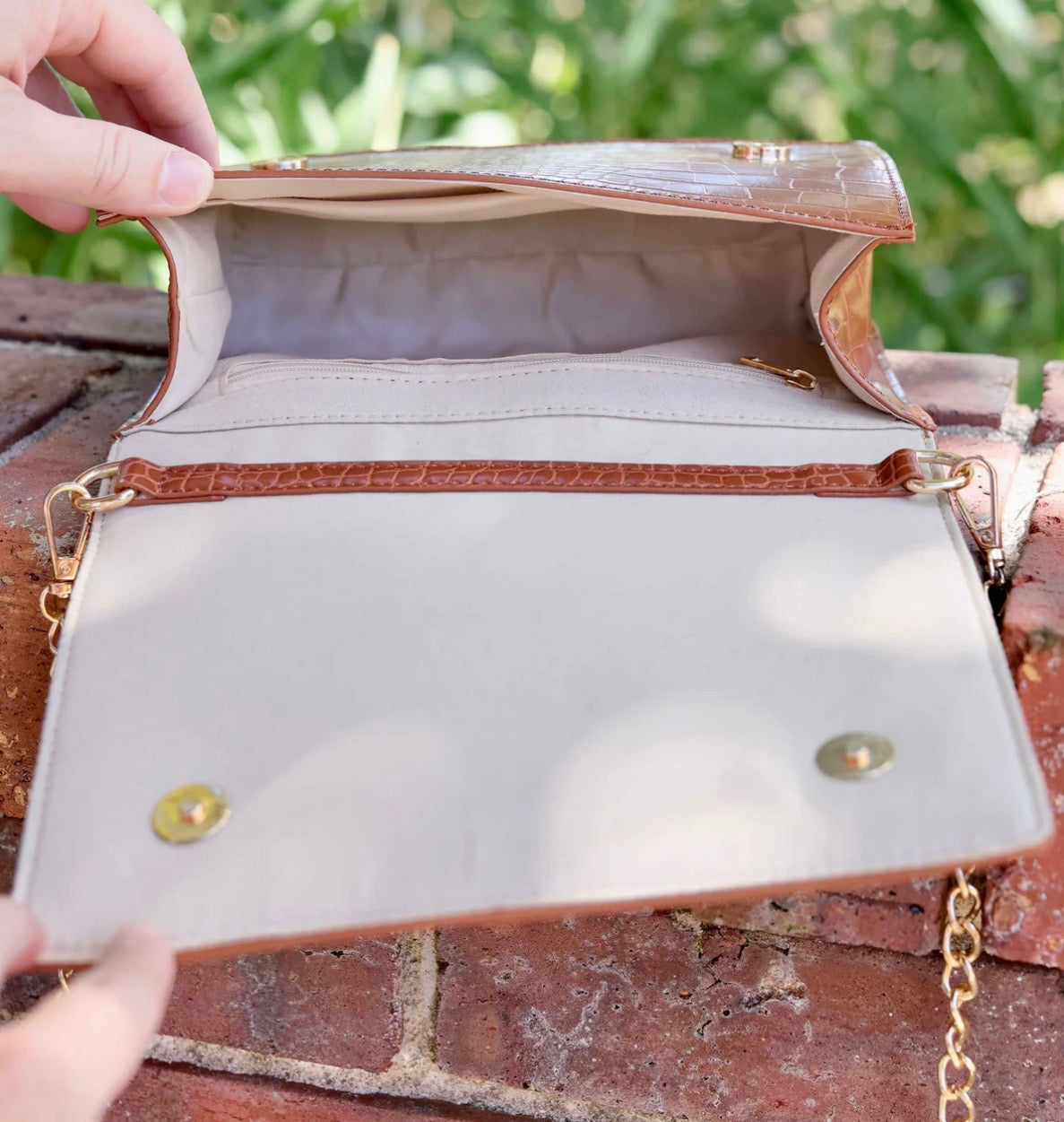 The Cecilia Circle Logo Handbag in Spotted Saddle combines sleek style with practical design. Its faux pony hair texture and boxy shape create a modern, fashionable look, while the fold-over design with a magnetic closure ensures secure access. Featuring a prominent Caroline Hill circular logo, this crossbody bag offers ample space for your daily essentials, making it an ideal accessory for both everyday wear and chic outings.